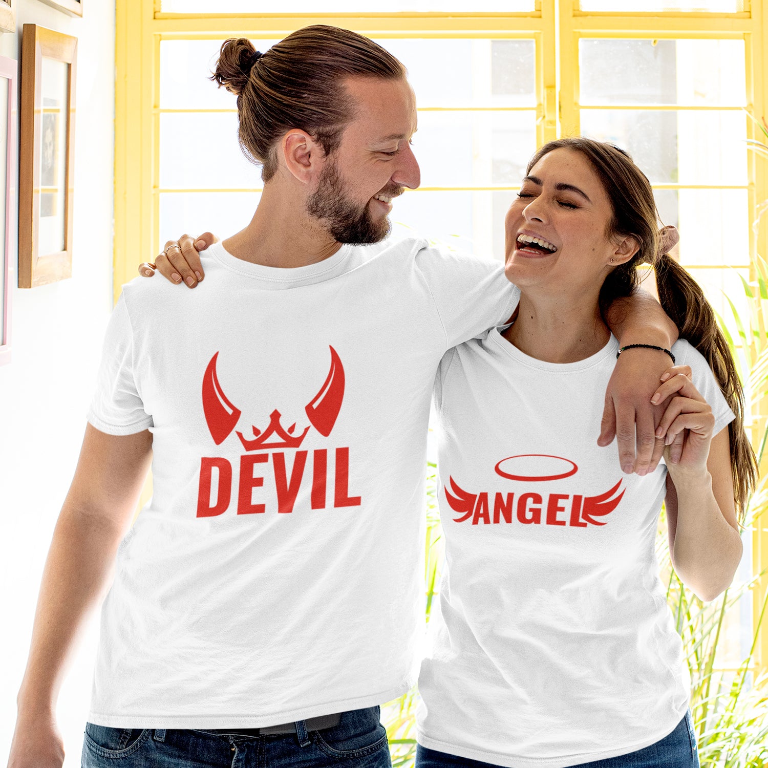 • Product Description: Perfect for you and your special one, our Devil T-Shirts and Angel White Couple T Shirts are a must-have for every loving couple. These couple t-shirts are just excellent to go out on a date with your cute partner.