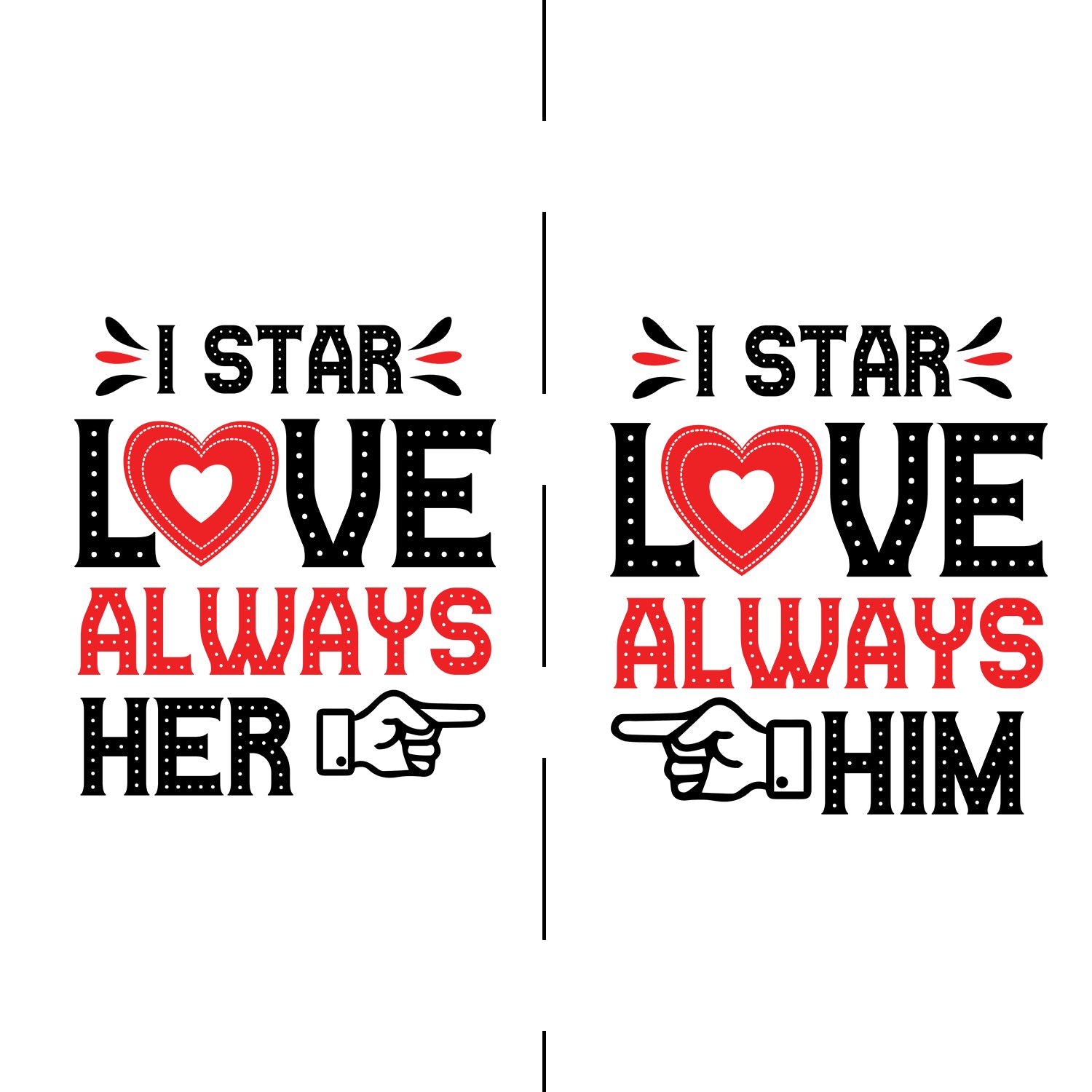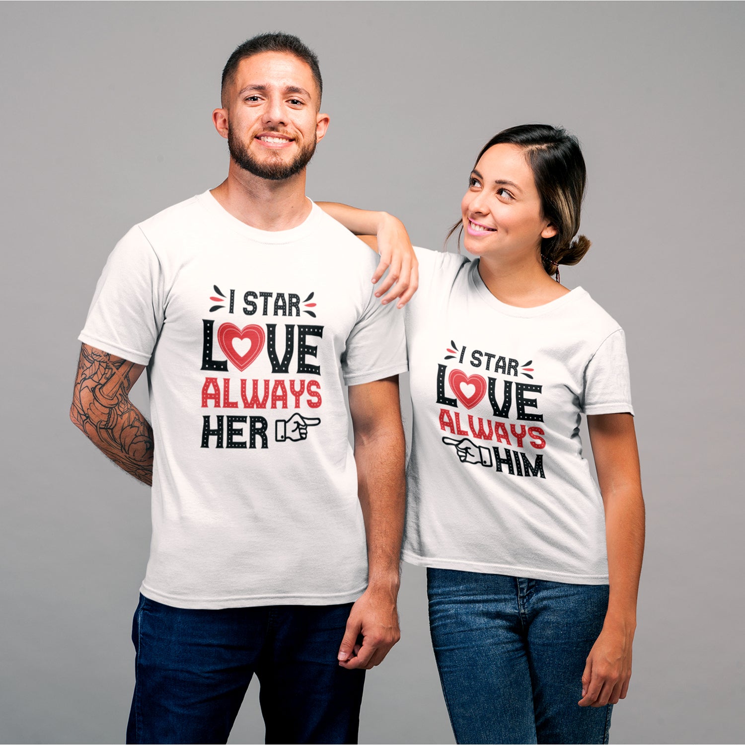 Product Description:Perfect for you and your special one, our I Star Love Always Her ,I Star love Always Him Couple T Shirts are a must-have for every loving couple. These couple t-shirts are just excellent to go out on a date with your cute partner.