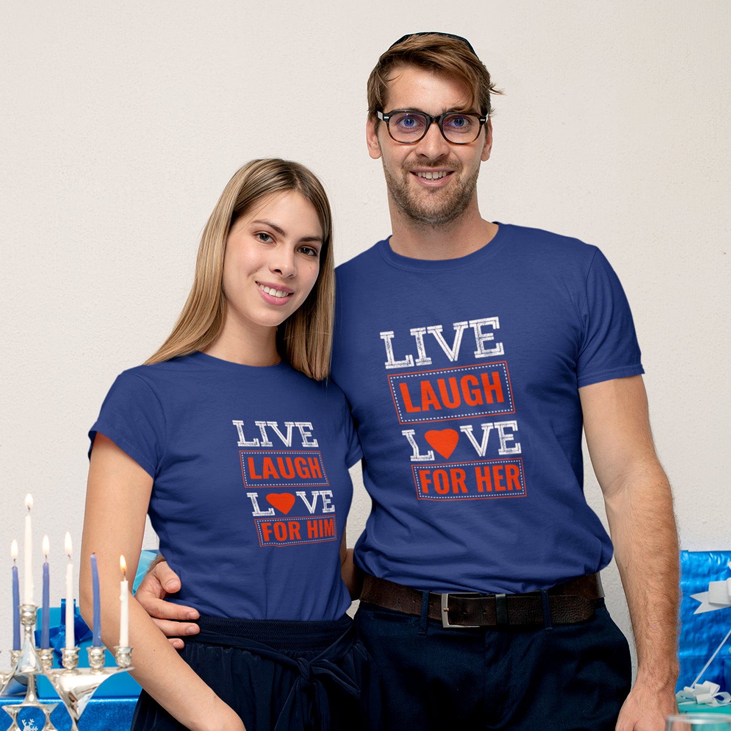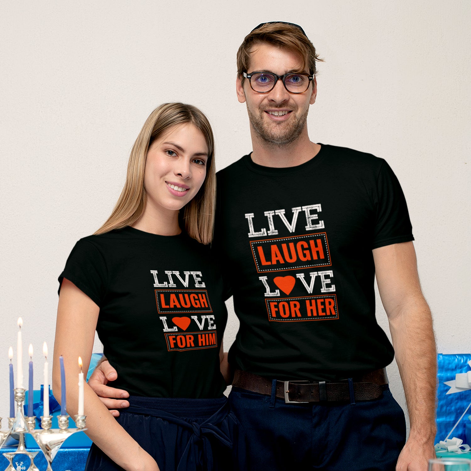 Product Description:Perfect for you and your special one, our Live Laugh Love Him ,Live Laugh Love Her Couple T Shirts are a must-have for every loving couple. These couple t-shirts are just excellent to go out on a date with your cute partner.