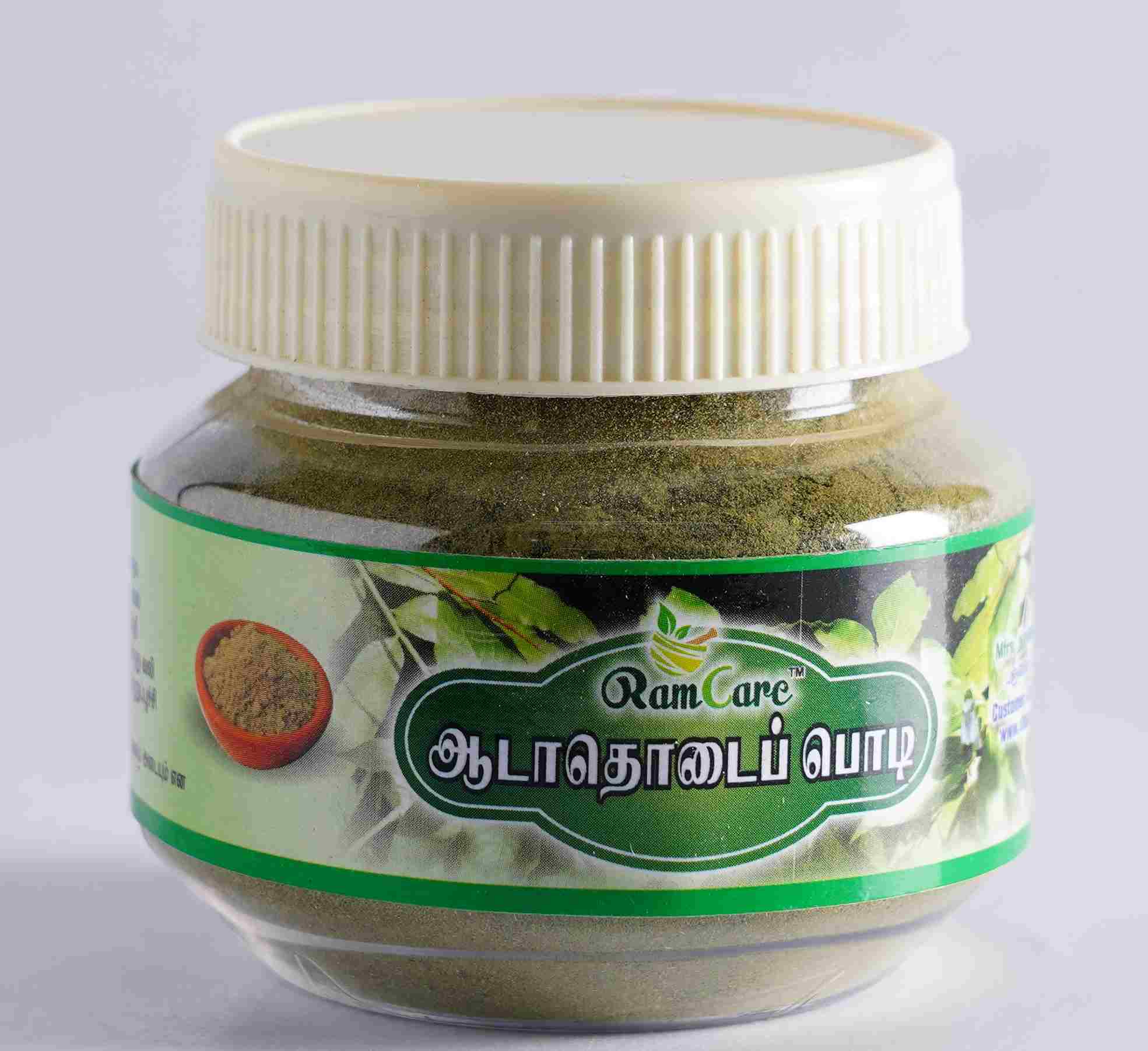 Adathodai (Justica adhatoda) botanical name commonly called as Malabar nut the leaf of this plant is consumed as a decotion for treating various problems. It contains alkaloids, flavonoids, tannins and also saponins. This powder is useful for all types of lung disorders.