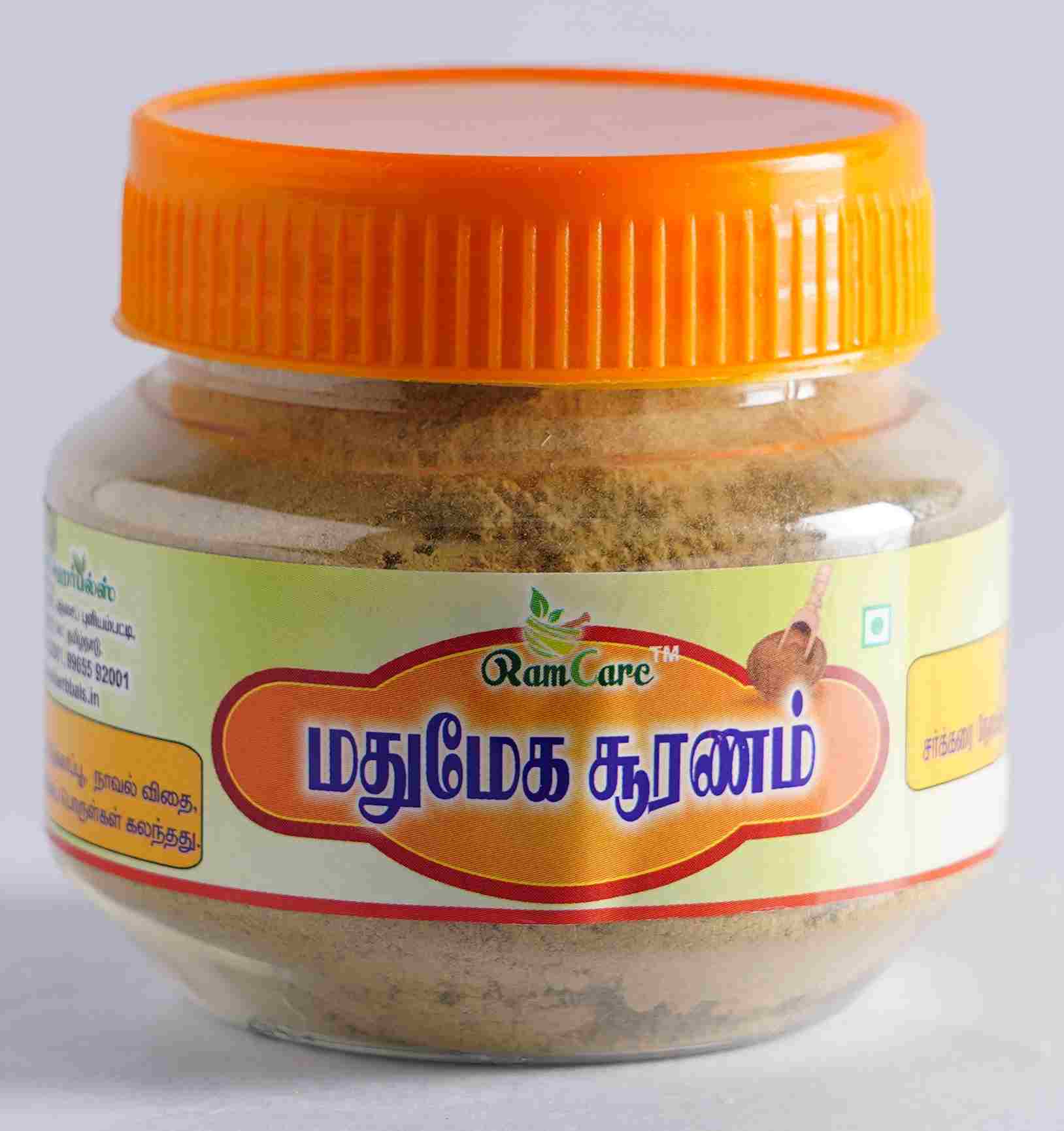 Madumega(sakkarai kolli ) choornam is a constituent of various herbal powders such as Gurmar(sirukurinjaan), avaram, vishnukiranthi, inknut flower, Jamun seeds, bael leaf, fenugreek, and 36 other rare herbals. This chooranam helps to treat diabetes.