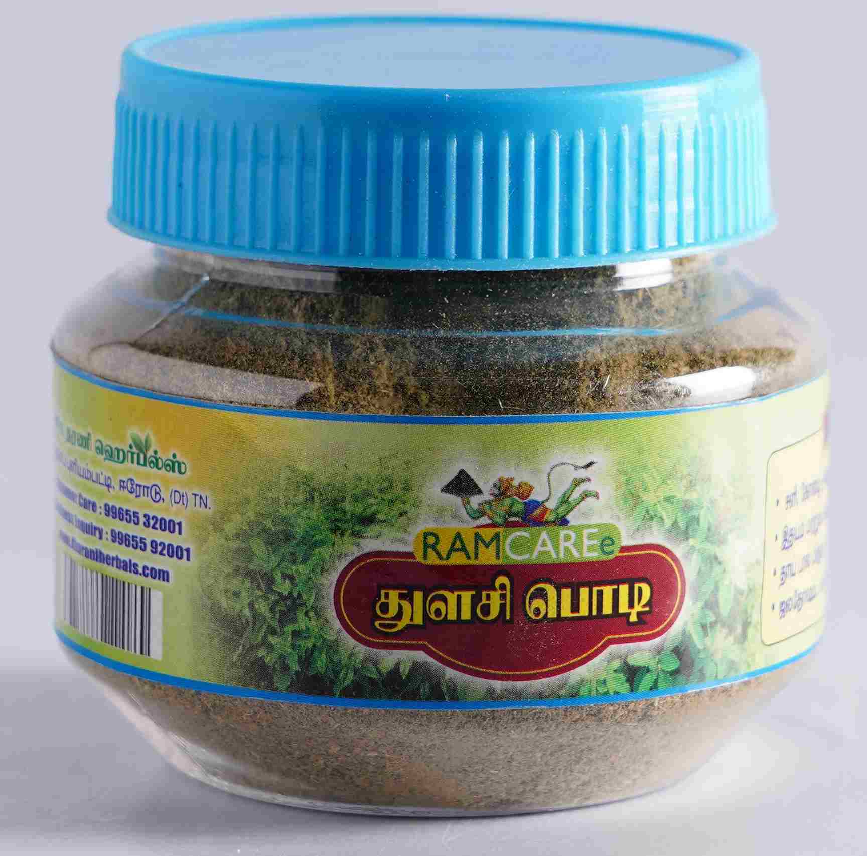 The tulsi-botanical name (Ocimum tenuiflorum) is considered a sacred plant in the place of worship, and also it has a higher medicinal value; it contains vitamin A, K, and also C, folate, and many other active compounds, present in it. Ramcare Tulsi Powder is consumed for cold, cough, heart and liver strengthen, breast milk increases, and also cures thorax infections.